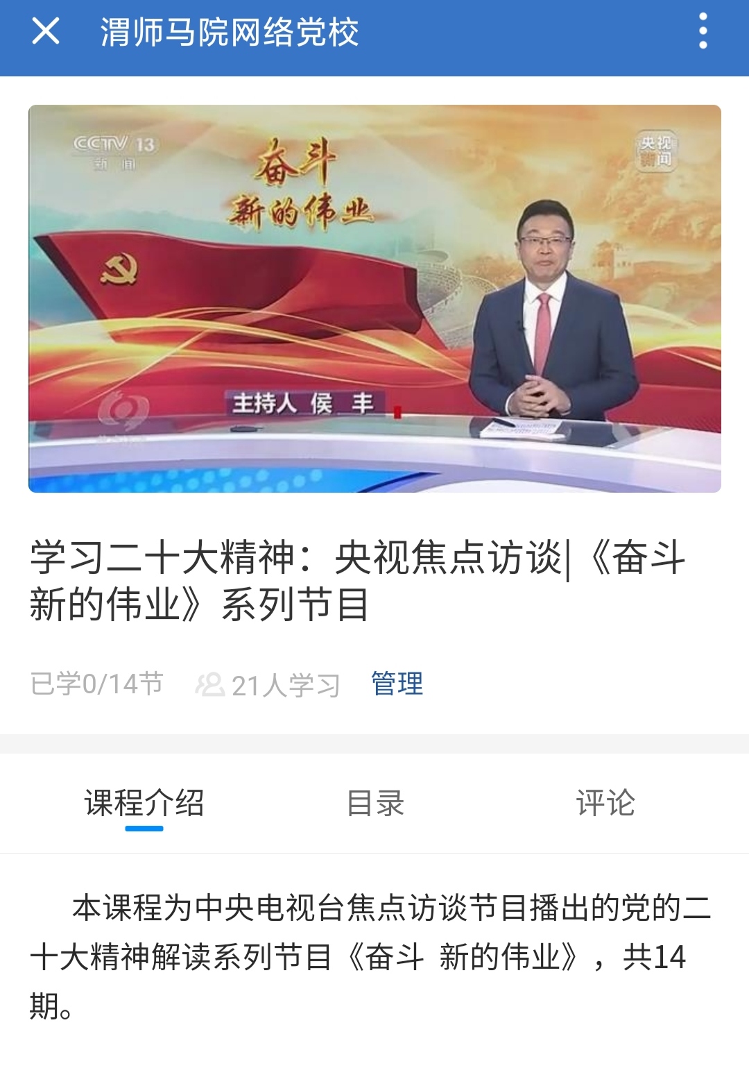 该课程全部为视频观看,共14节,素材来自于央视焦点访谈栏目播出的系列节目《奋斗 新的伟业》。14节课,分别从“非凡成就 伟大变革”、“理论创新 行动指南”、“使命在肩 勇毅前行”、“中国道路 复兴蓝图”、“着力推动高质量发展”、“发展全过程人民民主”、“文化自信 凝心聚力”、“增进民生福祉 提高生活品质”、“推动绿色发展 建设美丽中国”、“科教兴国 人才强国”、“全面依法治国 建设法治中国”、“以新安全格局保障新发展格局”、“全面从严治党永远在路上”和“新征程上党旗飘扬”等14个方面,邀请中央和国家部委有关负责人、专家学者、党的二十大代表等就二十大报告和二十大修改的党章作了生动、全面,适合普通大众的解读。