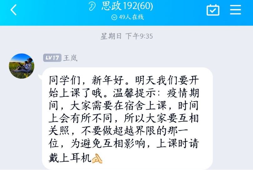 线上直播教学时,老师细化课堂内容,明确学习目标,并温馨提醒同学们,宿舍内空间狭小,为避免影响他人,自觉佩戴耳机。线上教学也妙趣横生,或评论,或发言,思维的碰撞从不间断。