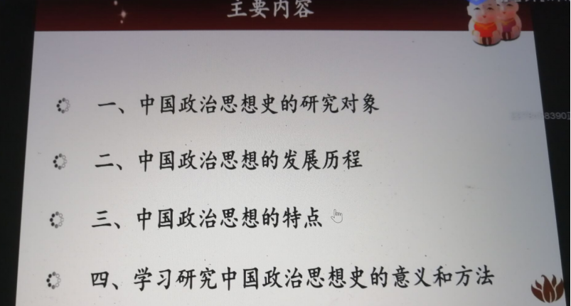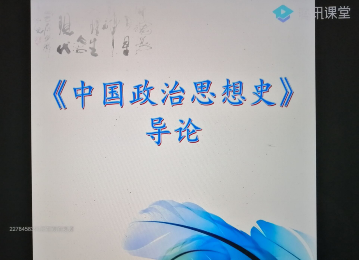 早上8:00正式在“腾讯课堂”平台开始上课,老师首先对《中国政治思想史》这门课程进行了介绍。并从四个方面向同学们阐述了中国政治思想史的研究对象、发展历程、特点、学习的意义和方法等。