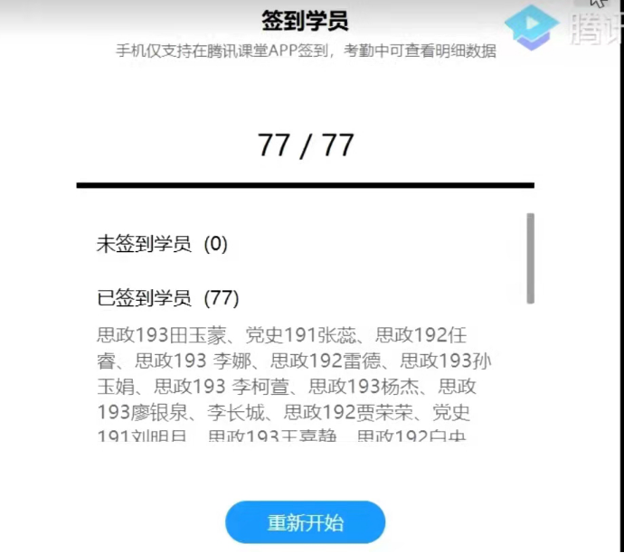 为保证线上课堂秩序,课程过程中在老师的指导下,同学们在“腾讯课堂”平台完成上课签到。