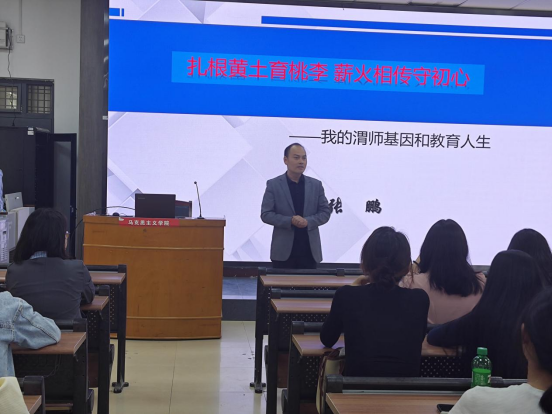 5月9日下午2:00,在1101,bevictor伟德邀请伟德bevictor官方网站2003级思想政治教育专业毕业生、潼关县优秀团务工作者、潼关县高考质量提升先进个人、渭南市中小学教师中、高级评审委员会评委、渭南市教育学会理事,渭南市高考政治学科试题评价分析讲师团成员、潼关中学副董事长张鹏老师来公司作题为《扎根黄土育桃李 薪火相传守初心》的报告。bevictor伟德部分教师、思想政治教育专业2022级员工等100余人参加,思想政治教育专业建设负责人周菊芳主持。