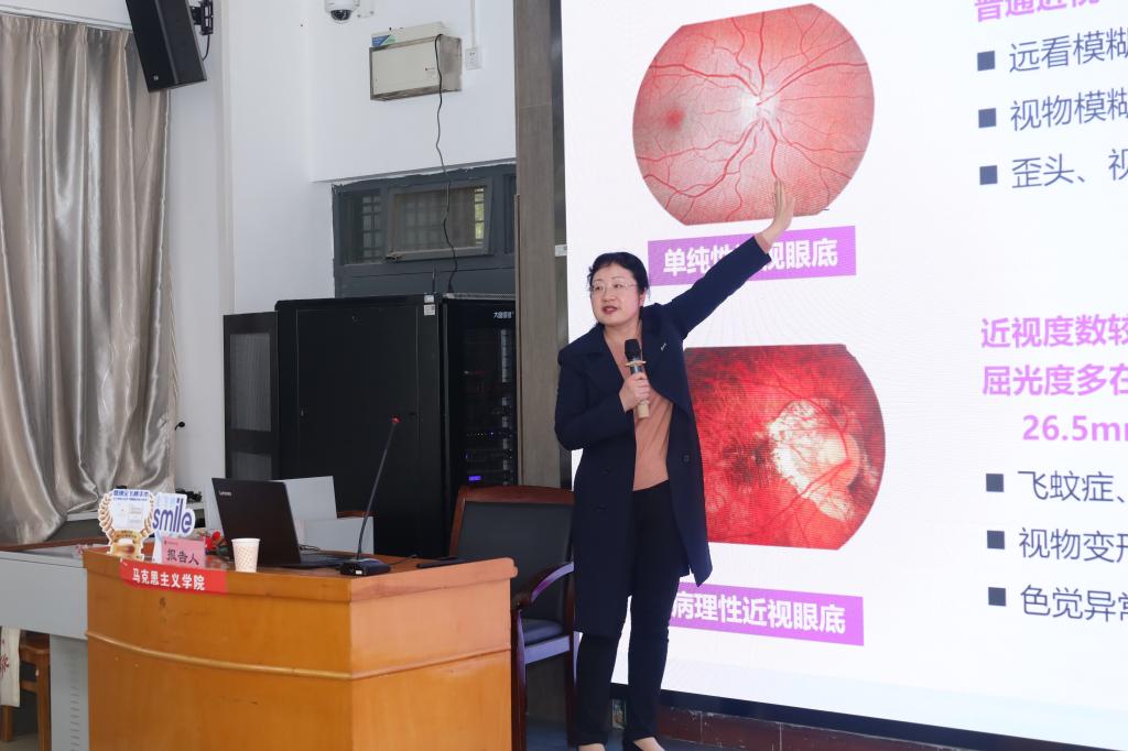 眼科主任医师、科主任田瑾医生以《久久为攻、共守光明未来》为题,讲解了各年龄段,特别是青年阶段容易产生的不健康视觉及其可能引起的眼疾、其它并发疾病,呼吁师生一定要重视、要学会正确用眼、保护眼睛、保护视力、正确矫正视力。随后,田医生分析了近视产生的各种原因、近视的危害,讲解了眼睛的结构、常见眼疾及其预防于治疗、近视及其预防、高度近视的危险行为、近视眼镜的选择、近视的各种治疗方式及其适应性等师生特别关注的眼睛健康知识。田医生还带来了自己的科普团队,在讲座后同师生进行了更为深入、广泛、具体的互动交流。