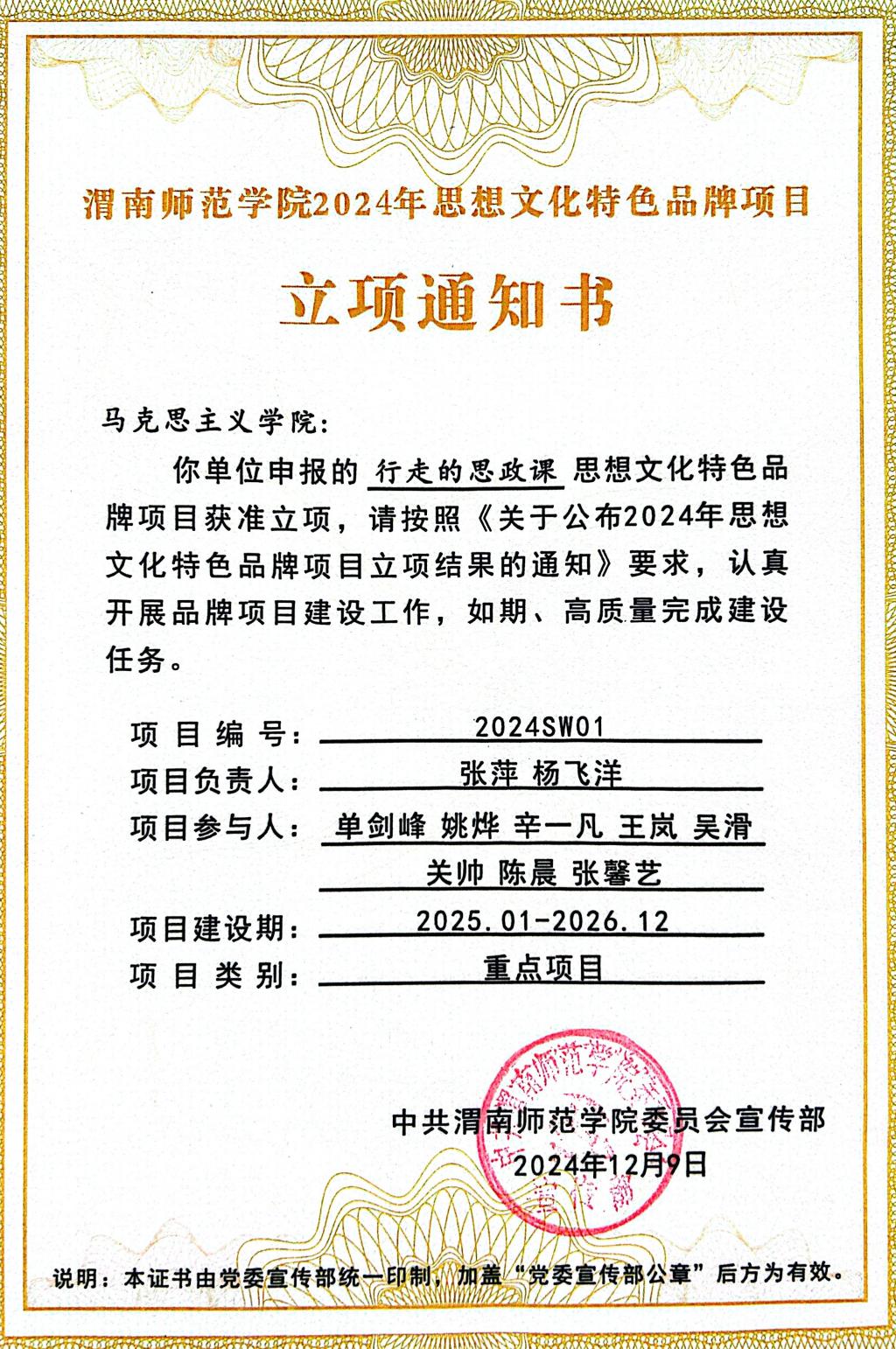 今日收到的公司党委宣传部文件《关于设立伟德bevictor官方网站2024年思想文化特色品牌项目的通知》显示,公司思政课教学实践“行走的思政课”经公司申报、学校组织专家评审,被学校确定为2024年重点特色思想文化特色品牌建设项目,项目建设期自2025年1月起共两年,资助经费2000元。