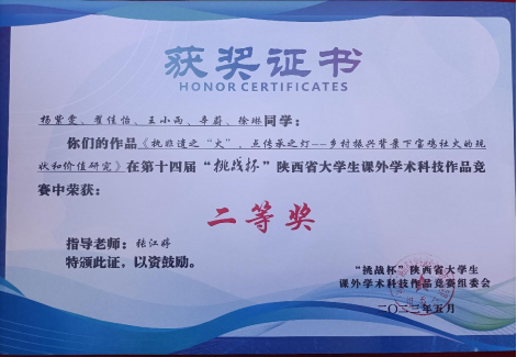 5月20日,由团省委、省委教育工委、省科技厅、省科协、省社会科学院、省学联、西咸新区管委会共同主办,长安大学承办的第十四届“挑战杯”陕汽集团陕西省老员工课外学术科技作品竞赛闭幕式暨颁奖仪式在长安大学圆满落幕。公司思想政治教育专业2021级杨紫雯、翟佳怡、王小雨、辛蔚、徐琳5名同学的作品《执非遗之“火”,点传承之灯---乡村振兴背景下宝鸡社火的现状和价值研究》获省级二等奖。