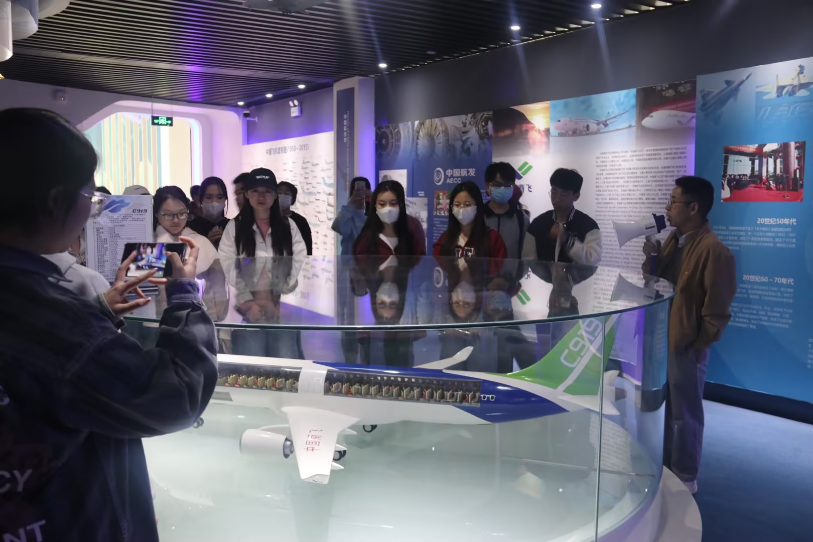 在科技馆,党员、师生目睹、触摸了歼5、运5等珍贵的飞机实物、航空发动机等零部件实物,兴致勃勃地同这些承载着我国航空事业历史的展品合影留念,看到了大量的从莱特兄弟制造的飞机,到我国著名的C919在内的飞机模型机,包括了飞机问世以来,中外大部分主要机型。