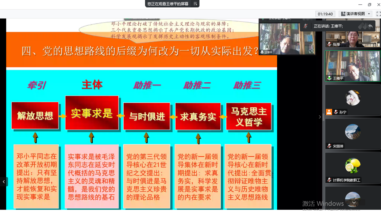 本场报告由兰州大学王维平教授以《党的二十大精神进课堂的十个表述、十个概念、十点思考》为题主讲。报告主题、结构简单、明了,但针对性及由此导致的现实意义极为显著。报告采用对照性、对比性的研究方法,坚持追问性、追溯性的研究原则,既有阐述性,又充满学理性,思想深邃,见解独到,问题提出切中要害,问题讲解有理有据,学术视野开阔,理论分析深入,文献材料丰富,语言风趣幽默,对公司教师提高马克思理论水平和思想政治理论教育能力,正确理解二十大精神,将二十大精神准确、深入、恰当融入课堂起到了显著的指导作用,听讲教师普遍认为受益匪浅。