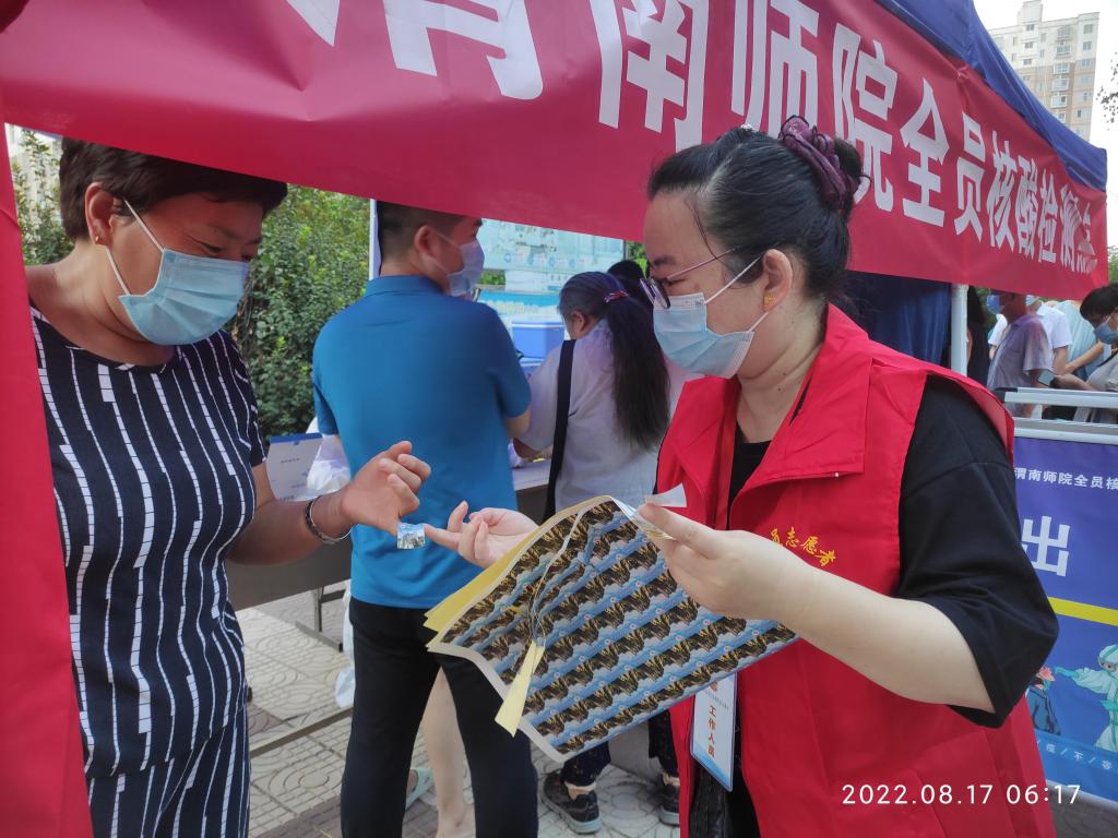 从17日凌晨5时至10时,19名师生分赴河洲花园、西岳校区、朝阳校区的五个采样点,分工协作、各司其职,顺利完成了扫码登记、贴纸发放、检测呼叫等工作,受到了师院社区党支部的充分肯定。