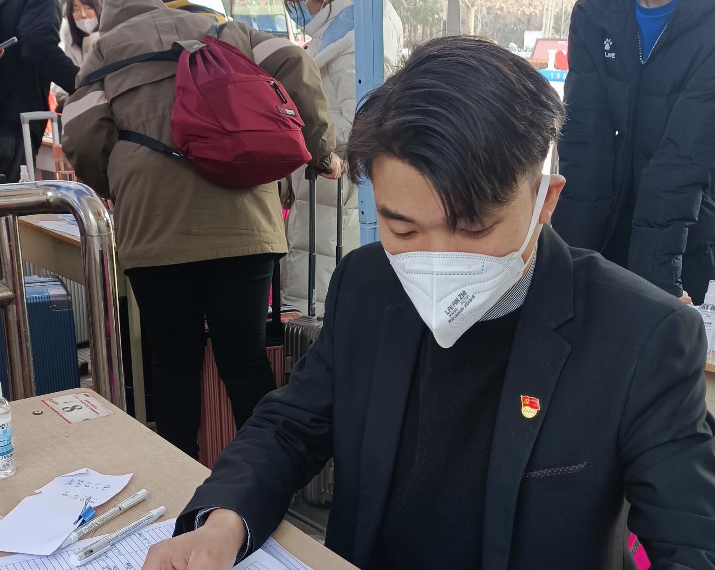 本学期员工开学报到三天,按照学校安排,公司需要安排辅导员连续三天,每天连续15个小时在校门口查验入校员工各项健康证明、测量体温、登记入校员工。因突发情况,至报到第一天12时,公司只有一名辅导员可以在岗工作,已经难以完成学校安排的任务。为解决燃眉之急,公司紧急面向学院教师招募此项工作志愿者,公司青年教师、共产党员周韶尉、杨颜荣两位老师迅速反应,报名参加。其中,周韶尉老师在招募公告发出后半小时按照安排达到了工作岗位。