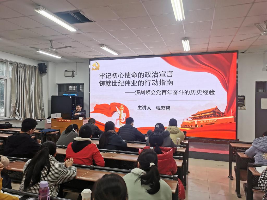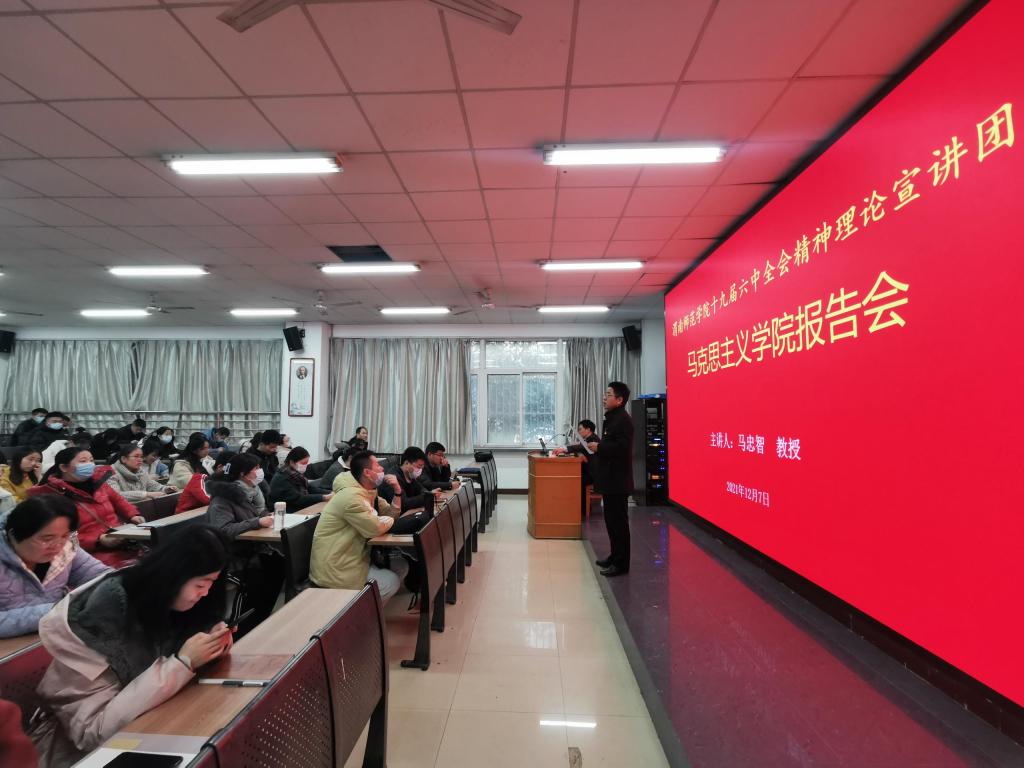 主持人还对到场师生提出了几点希望:希望员工能从报告,特别是报告阐释的建党百年来的重大成就中体会“四个自信”的合理性;希望学院教师,特别是思政课教师向马忠智老师学习,积极、深入研究十九届六中全会精神,在教研室或课程团队的指导下将全会精神融入课程教学;希望学院管理教师从报告阐释的建党百年来的历史经验中吸取营养,积极改进、努力做好自身的管理、服务工作;希望各课程团队,特别是思政课教研室制定或完善全会精神进课堂指导意见或具体方案,低成本、高效率地落实学院全会精神进课堂要求。