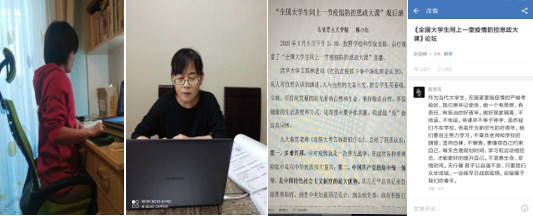 大家认真听课,获益匪浅。课后,师生在线进行了热烈的讨论和交流,一致认为,今天的思政大课直播非常精彩,艾四林、秦宣、王炳林、冯秀军四位专家教授理论联系实际,用马克思主义基本原理分析这场新冠肺炎疫情大考,引导老员工在抗击疫情斗争中深化理论认识、社会主义制度和党的领导的优越性、构建历史的经验与反思、青春爱国责任与担当等问题,条理清楚,逻辑严密,以理服人,以情动人,效果良好。