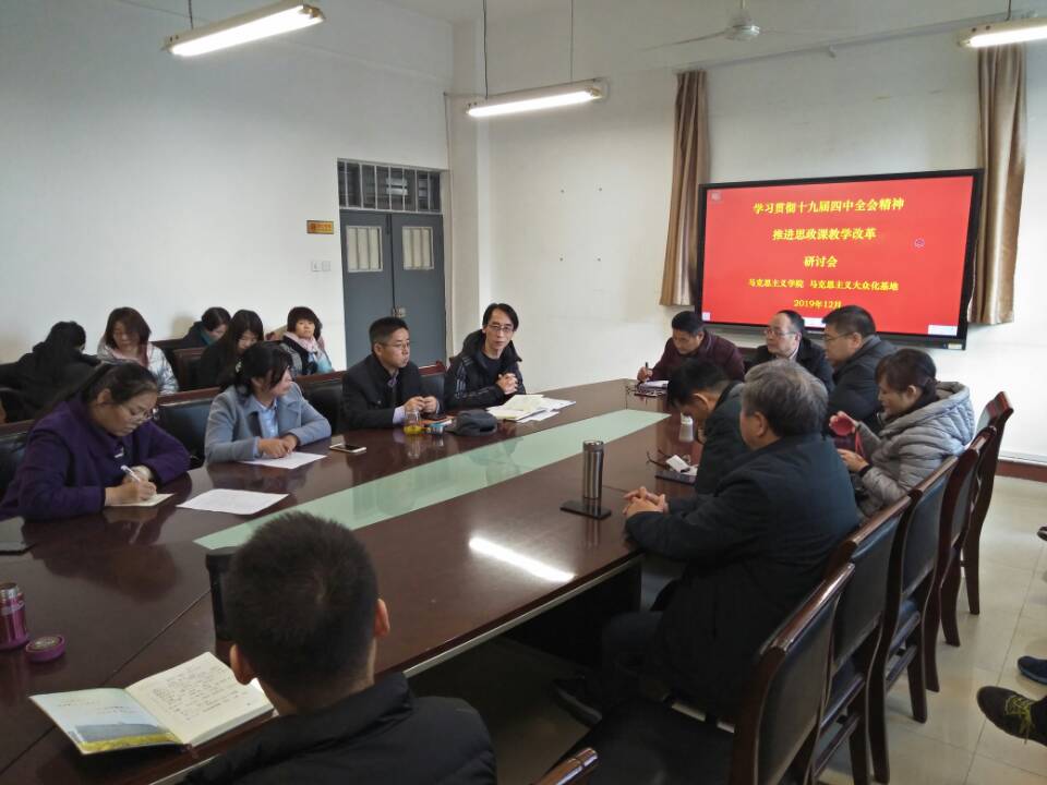 党的十九届四中全会,是在新中国成立70周年之际、“两个一百年”奋斗目标历史交汇点上,我们党召开的一次具有开创性、里程碑意义的重要会议。认真学习贯彻十九届四中全会精神,迅速把思想和行动统一到习近平总书记、党中央的决策部署上来,是学校当前和今后一个时期的首要政治任务。根据渭南师范公司党委《关于认真做好十九届四中全会精神学习宣传的通知》要求,12月11日下午,bevictor伟德在1218会议室举办了学习贯彻十九届四中全会精神、推进思政课教学改革研讨会,学院全体教师参加。会议由学院经理白赵峰主持。