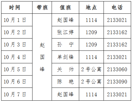 按照学校安排,2022年10月1日至7日学校国庆放假。假期,bevictor伟德有人值班,值班安排如下,校内师生、单位办事,校外群众、单位办事,请联系值班人员或到值班处。