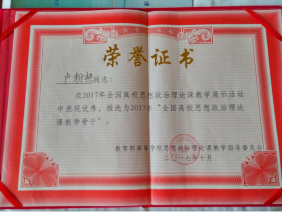 “全国高校思想政治理论课教学骨干”获奖证书